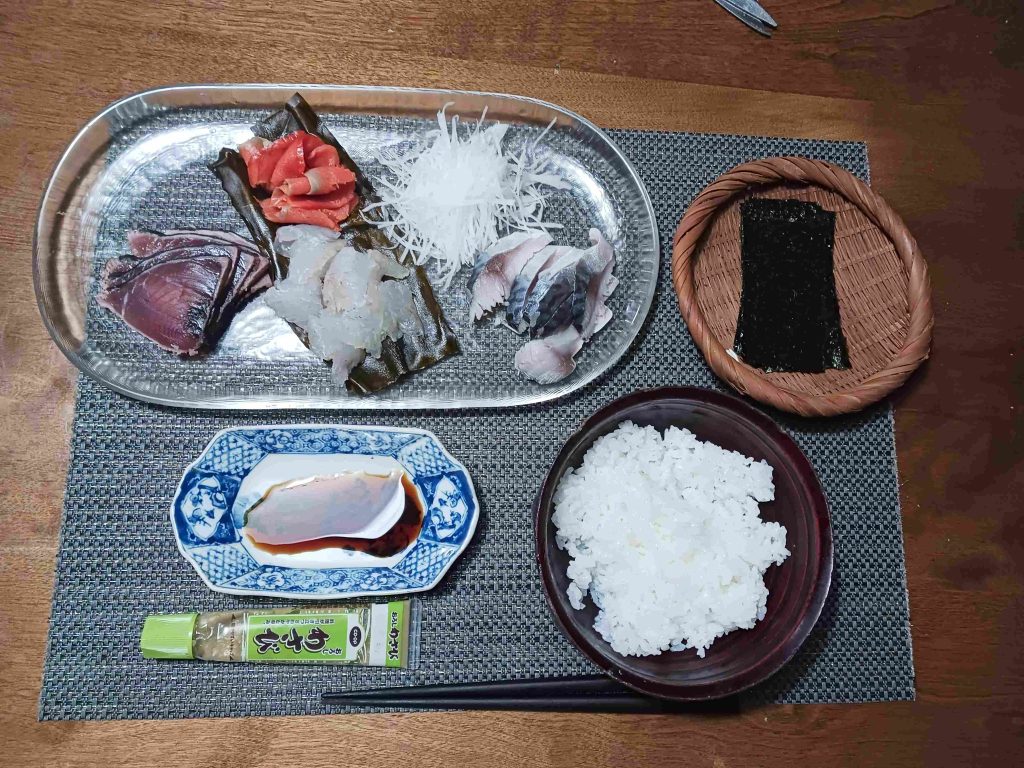 わしの晩飯ー近所からいただいたヒラメを、かみさんが握りずしにした逸品です。