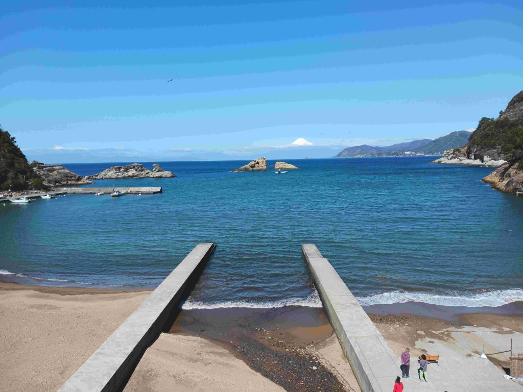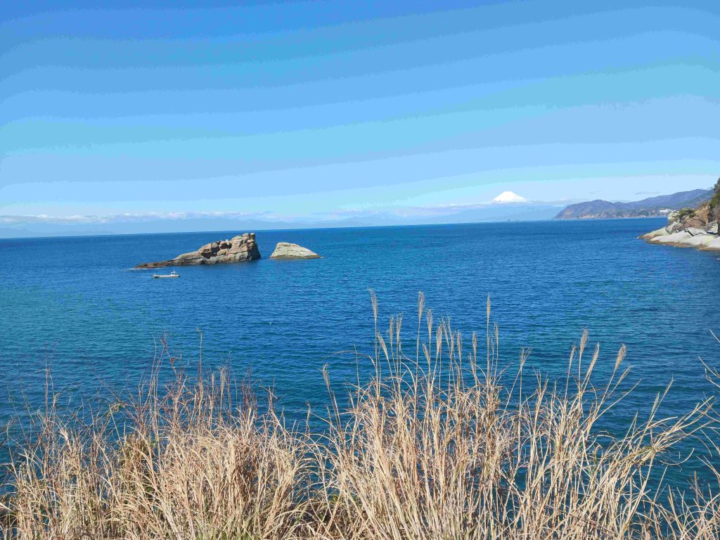 目の前に広がるのは、どこまでも青く深い海。そして浜から300m先に三角帽子の夫婦岩、その遥か向こうの雲上にダイヤモンドのような白雪富士山頂上がに光り輝く。圧倒的な存在感である。荒々しい海岸線の奇岩や断崖を額縁に見立て、海面に浮かぶように姿を見せる霊峰の神々しさ。思わず手元のスマホをかざしたが、その小さな画面に映る富士は、私が肉眼で捉えたあの「魂を揺さぶる巨大さ」には遠く及ばない。