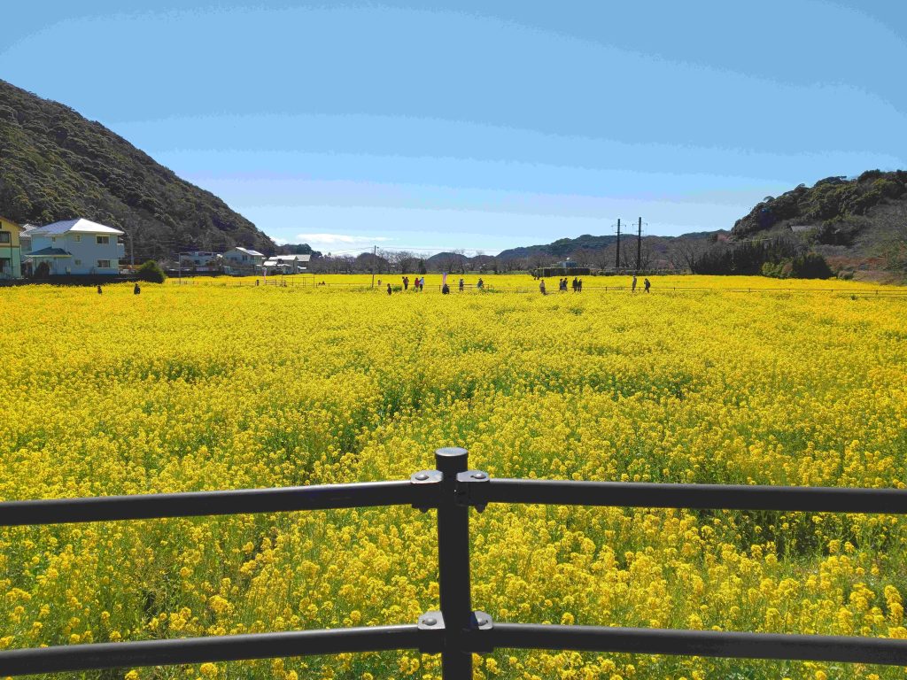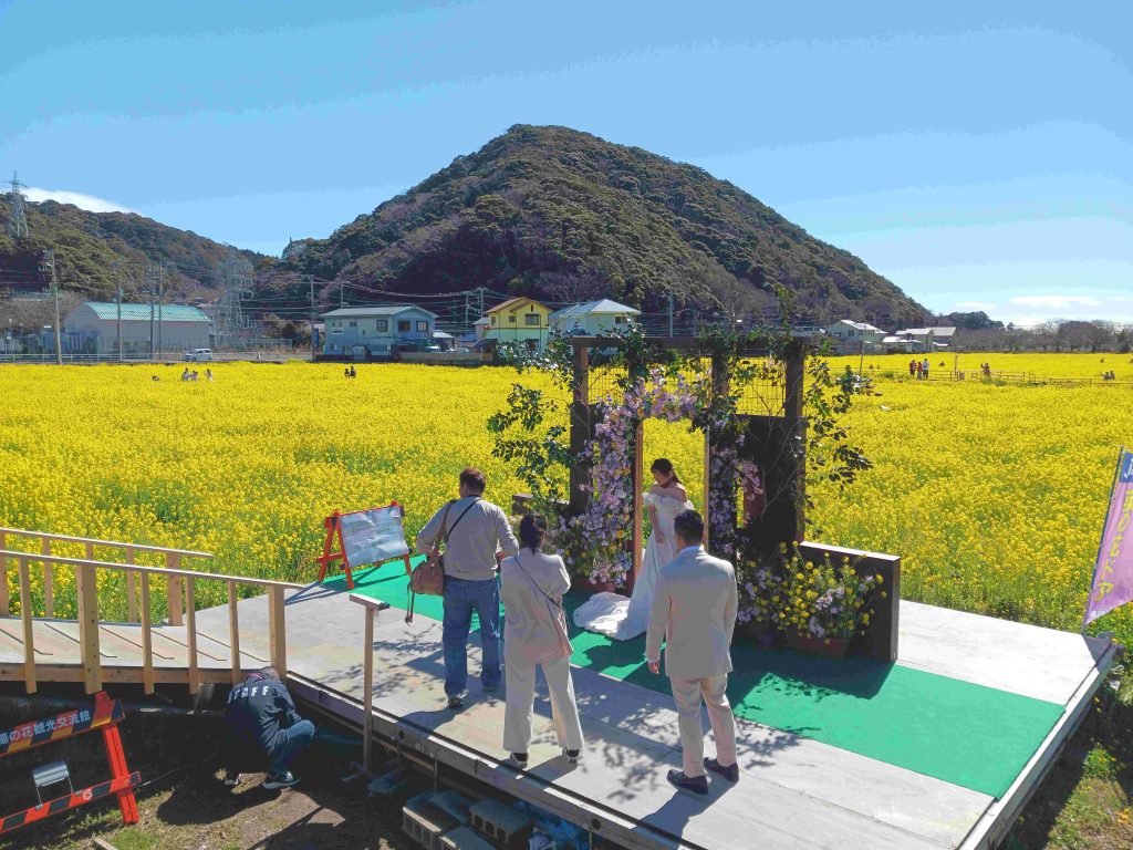 しばらく行くと全面がまつ黄色の菜の花畑が見えてきた。ストップして菜の花が一斉に祝福しているよな結婚式のカップルをスマホに収めた。