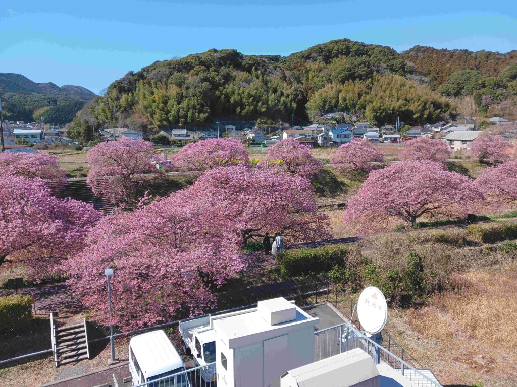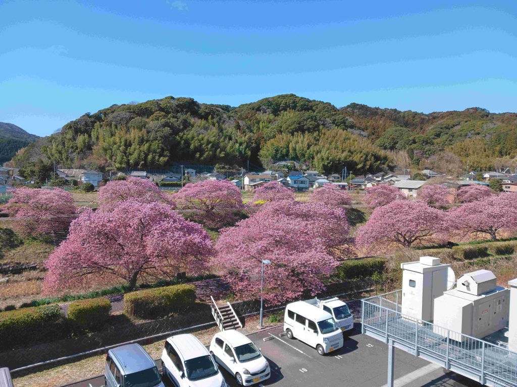 「南伊豆役場」に到着。早速二階の見晴・撮影台に上る。すぐ横の小川の両サイドの土手には約200mにわたって100本近い『豪華な河津桜ロード』がほぼ万華鏡状態で我々を歓迎している。