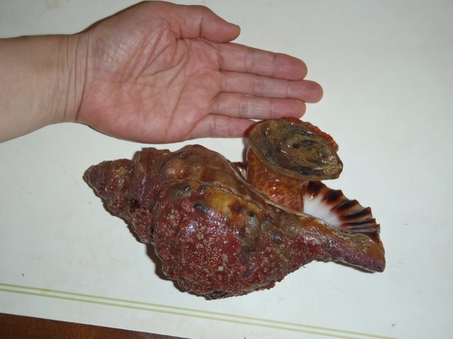 アワビ、サザエ、トコブシなどはこの辺の海でもたくさんとれるし、たくさん食べたが、ホラガイを食べるのは生れて初めてじゃ。ワクワク!