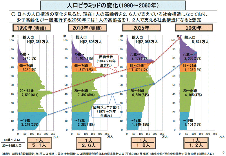 しかも、人口が減少するという量的側面だけではなく、高齢者の構成比が高まるといった質的変化が同時に進行します。グラフは1990年から2060年に至る人口ピラミッドの変化を示したものですが、65歳以上の高齢者を支える若い人の厚みが狭まって行く様子が明らかです。1990年の段階では5人で1人の