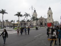 アルマス広場:リマ スペイン植民地支配の際、都市中心にアルマス広場を築いた世界遺産登録リマ旧市街(セントロ)中心地。 奥に見えるがカテドラル