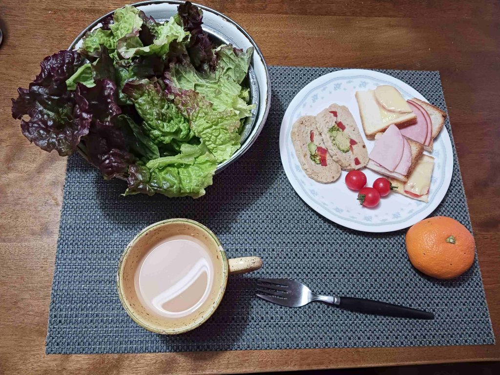 今朝の私のモーニング・サニーレタスの大盛、サンドイッチ、ダージリンティーのミルクです。体の調子も最高!